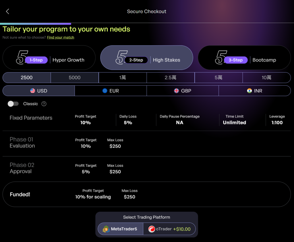 一步到位挑戰(新趨勢) 直接達到 10% 獲利目標即可拿到資金,適合不想分兩階段的人。